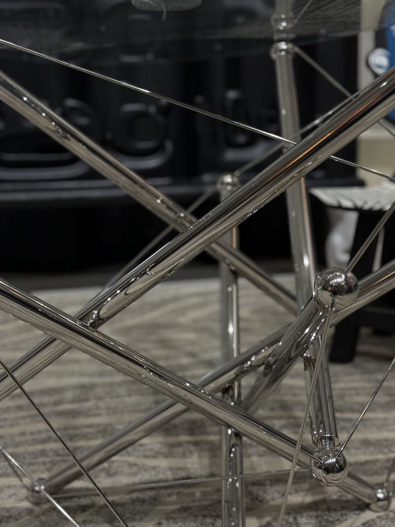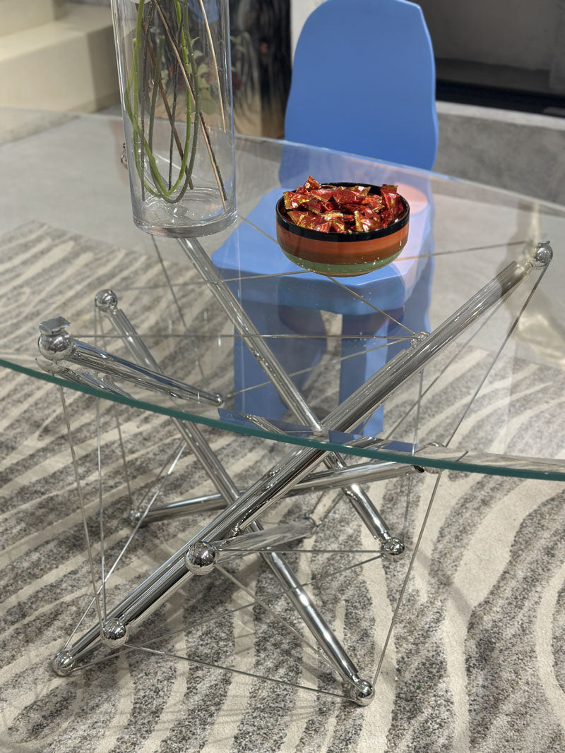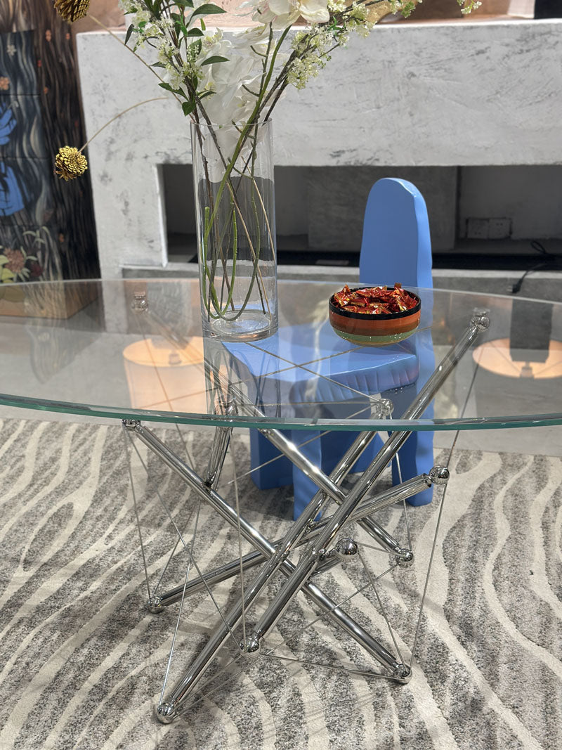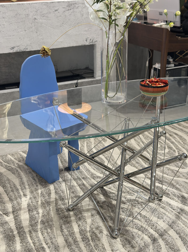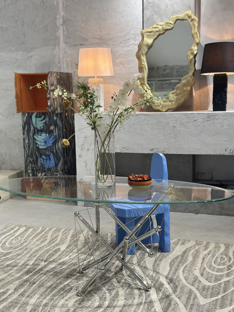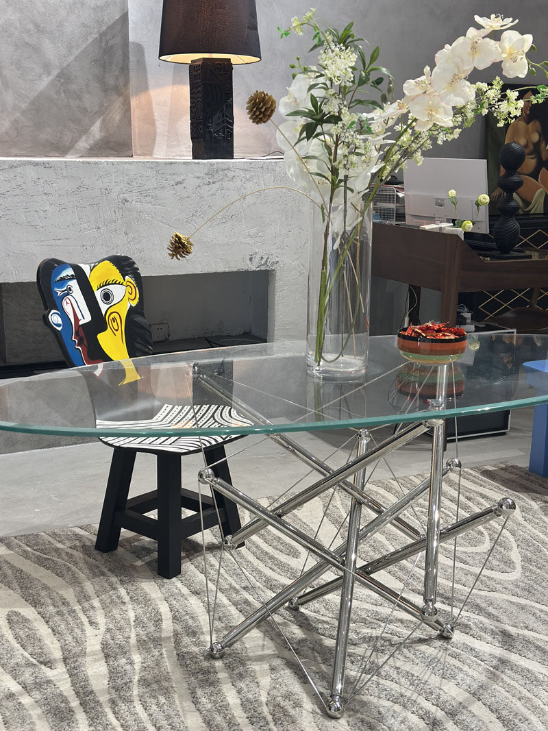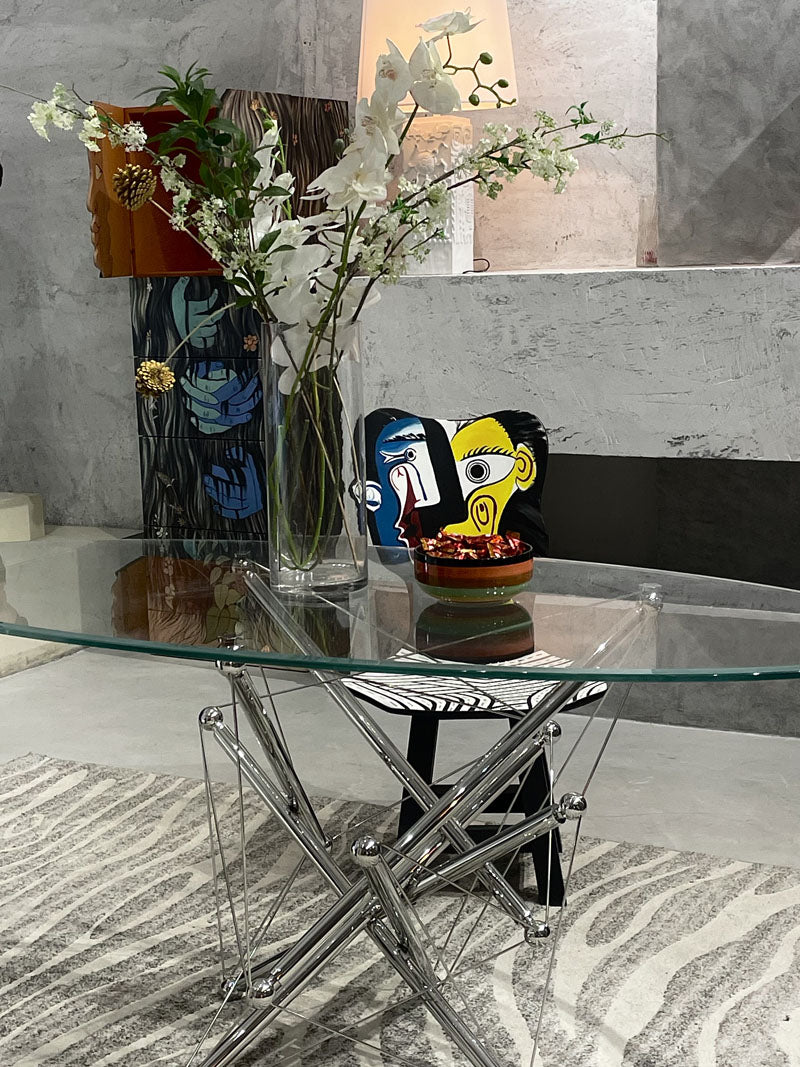 This sleek oval glass dining table is a masterclass in modern elegance—its transparent top feels light yet luxe, while the sculptural chrome base adds an industrial-chic edge that catches the light beautifully. Paired with an artful, Picasso-inspired chair (that bold pop of color! ), it turns any dining nook into a statement-making spot where style and function meet effortlessly. The fresh floral arrangement on top softens the sharp lines, making it the perfect centerpiece for both quiet meals and lively gatherings.